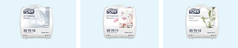 A Tork folyamatos adagolású légfrissítő nem csak a kellemes környezetről gondoskodik a mosdókban, de megkönnyíti az utántöltést, és ezáltal hatékonyabbá teszi a takarítást. Háromféle gondosan megválasztott illattal elérhető, melyek nem csupán elfedik, hanem meg is szüntetik a kellemetlen szagokat.