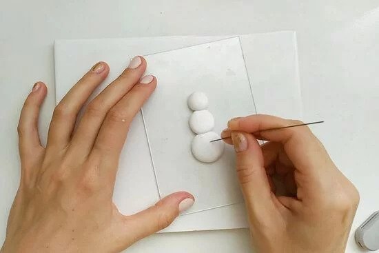 1. Készítsünk három különböző méretű golyót a FIMO fehér gyurmájából. Formáljunk egy hóembert belőle, majd tű segítségével alakítsuk a gyurmát úgy, hogy olyannak tűnjön, mintha hóbol készítettük volna.