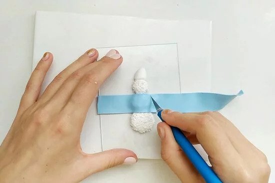 2. Használjunk fehér FIMO gyurmát és készítsünk sapkát a hóemberünknek. Nyújtsunk ki egy hosszú, vékony lapot a FIMO pasztellvíz színű gyurmából. Helyezzük a középső golyóra, ez lesz a hóemberünk pulóvere. Nyomjuk rá, majd a vágjuk körbe a FIMO vágókés készlettel.