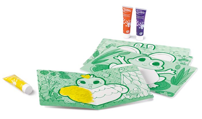 Légy kreatív: a tökéletes ujjfestő készlettel! 2 éves kortól ajánlott összehajtható lapok farm témájú illusztrációk béka, nyúl, csirke és egér ábrák a doboz tartalma: 4 db foglalkoztató lap 3 x 30 ml-es ujjfesték (narancssárga, lila, sárga)
