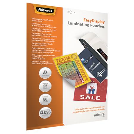 KezdőlapTechnológiaIrodatechnikaLaminálásMeleglamináló fólia, 80 mikron, A3, fényes, öntapadó, 25 db, FELLOWES "Admire Easy Display"