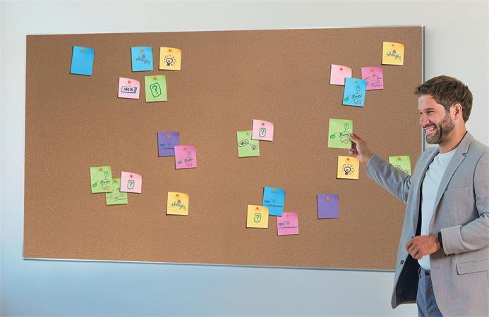 Széles képarányú parafatábla modern, keskeny kerettel és nagyobb felülettel a jegyzetek, üzenetek kifüggesztéséhez.