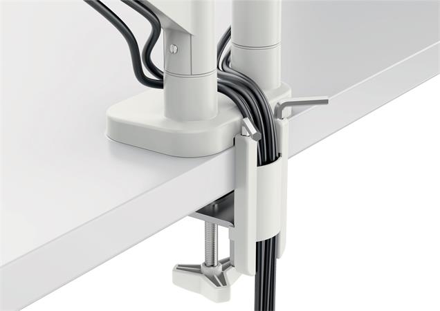 -könnyen felszerelhető a mellékelt gyorskioldású, levehető Vesa® lemezzel (75 és 100 mm) és szilikon gumírozott U-alakú szorítópánttal, amely csökkenti a rezgéseket és védi az íróasztal felületét, vagy az asztalon található furaton keresztül (asztali vastagságtartomány: 10-80 mm)