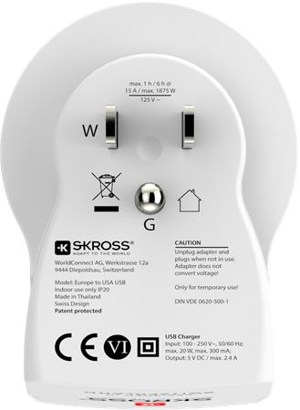 Skross USA csatlakozó átalakító és USB töltő egyben, Európából Egyesült Államokba utazóknak. A 2 x USB bemenet lehetővé teszi az okostelefon és táblagép egyidejű töltését, míg egyidejűleg földelt eszközzel is használhatjuk (laptop, hajszárító). Feszültség átalakítására nem alkalmas!