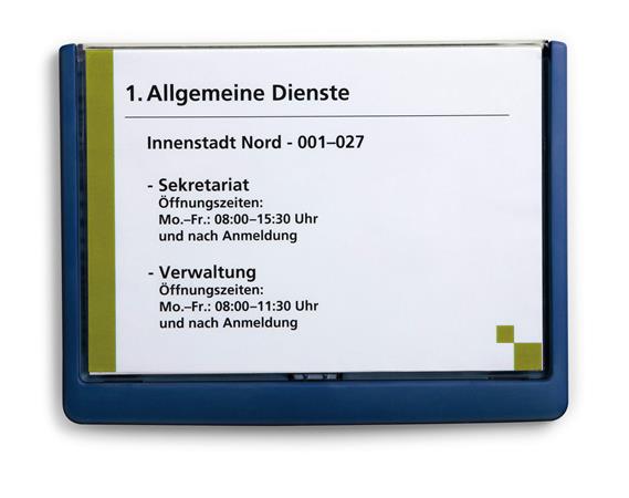 KezdőlapÜzemeltetésLétesítmény üzemeltetésInformációs és tájékoztató jelekInformációs tábla, 210x148,5 mm, DURABLE "CLICK SIGN", kék